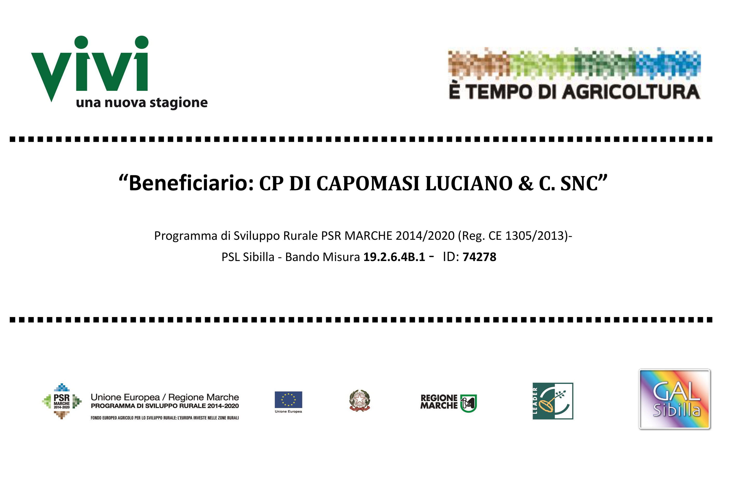 Progetto: “GREEN CYCLE DESIGN” Composizione del Partenariato Tm Italia Srl – CP di Capomasi Luciano & C. Snc – Mga Srl cofinanziato dal Fondo Europeo di Sviluppo Regionale BANDO: POR MARCHE FESR 2014/2020 - ASSE 8 - OS 23 - AZIONE 23.1 - INTERVENTO 23.1.1 – Supporto alla competitività del made in Italy attraverso lo sviluppo di “ambiti applicativi innovativi”, ai fini della rivitalizzazione delle filiere produttive colpite dal terremoto: Domanda di Partecipazione: 17226 Importo contributo riconosciuto: euro 120.000,00 ---------------------------
